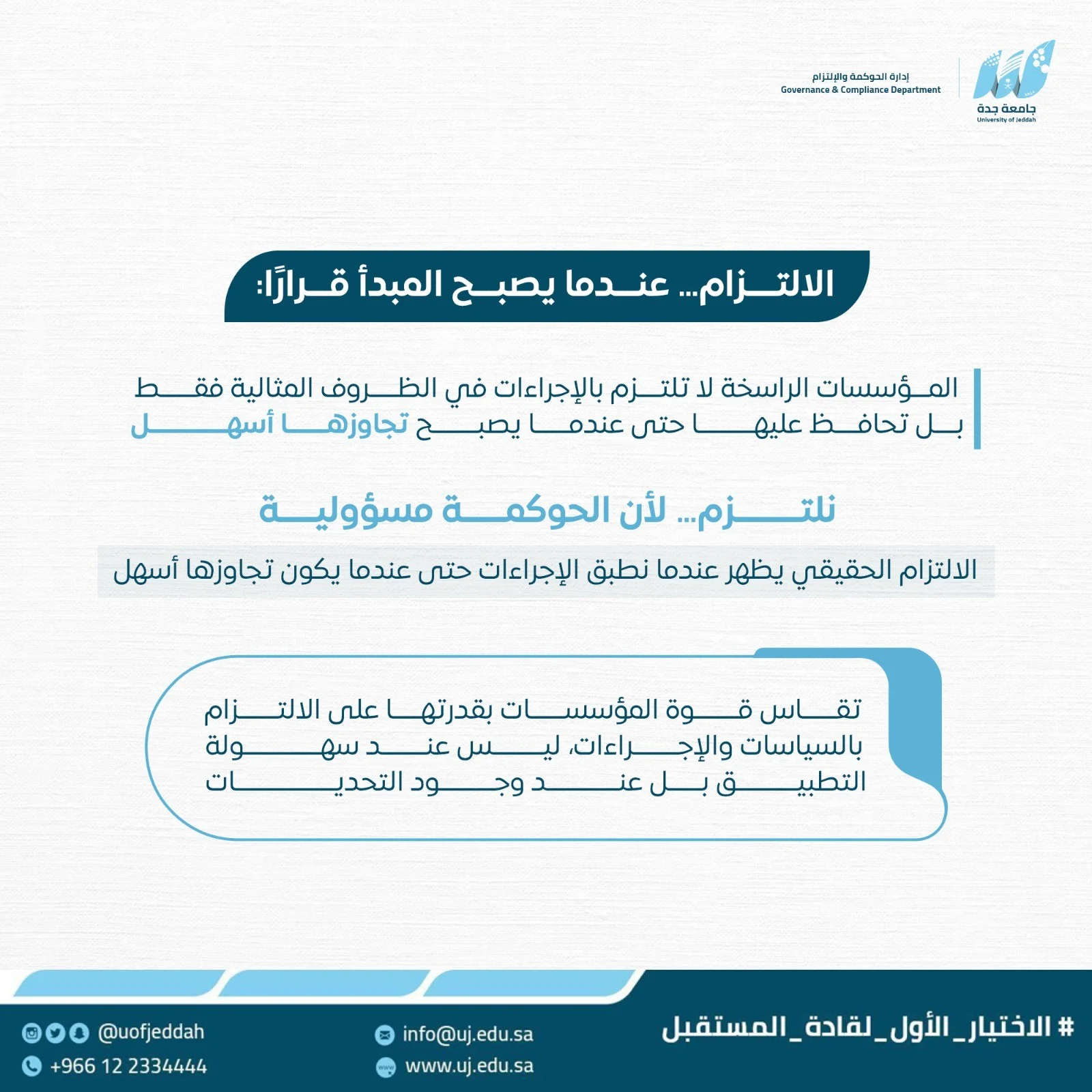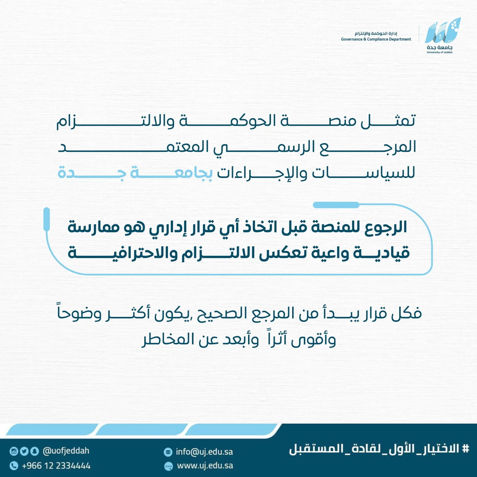 إدارة الحوكمة والالتزام هي من الإدارات الحديثة ، تم إنشاءها بقرار إداري رقم 460501284 بتاريخ 20/2/2025 تضم وحدتين: وحدة السياسات والإجراءات و وحدة المتابعة ، تعنى إدارة الحوكمة والالتزام بتعزيز مبادئ الشفافية و النزاهة و المساءلة داخل الجامعة، من خلال التأكد من وضع السياسات واللوائح و تحديثها ، و تحديد المسؤوليات و الصلاحيات بوضوح و متابعة مدى الالتزام بها .مما يسهم في تحقيق رؤية الجامعة و أهدافها الاستراتيجية